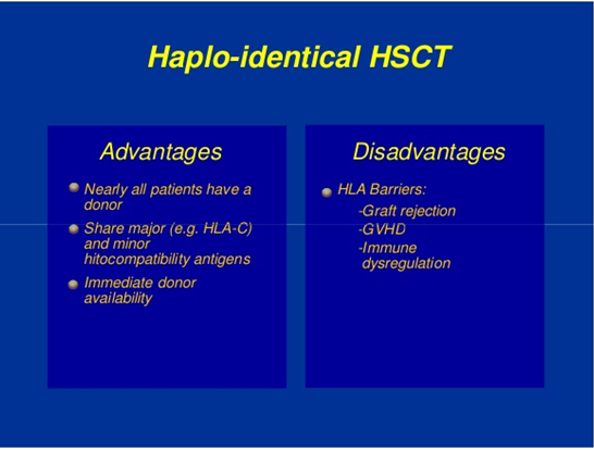 The degree of HLA matching ensures that the stem cells that are introduced into the patient are not ‘rejected’ by the immune system of the patient. The vice-versa is also true i.e., the risk of graft versus host disease (GVHD – donor cells acting against host tissues) is also dependent on the degree of HLA match. So, a fully matched sibling donor transplant requires the least immune suppression to prevent graft rejection and GVHD. In contrast, for a Haplo-identical transplant the chances of both of these complications is very high and hence potent immunosuppression is needed. This in turn places the patient at high risk of opportunistic infections.